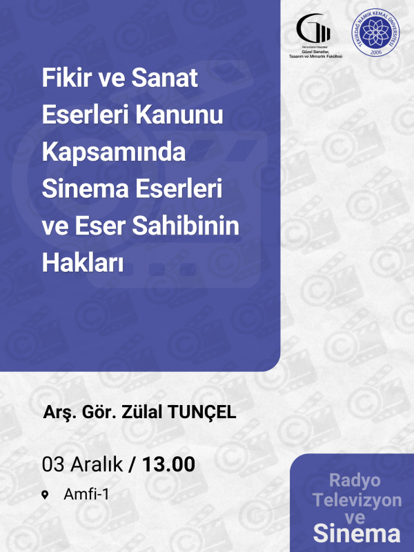 Arş. Gör. Zülal Tunçel tarafından gerçekleştirilecek Fikir ve Sanat Eserleri Kanunu Kapsamında Sinema Eserle... Ayrıntı İçin Tıklayınız...